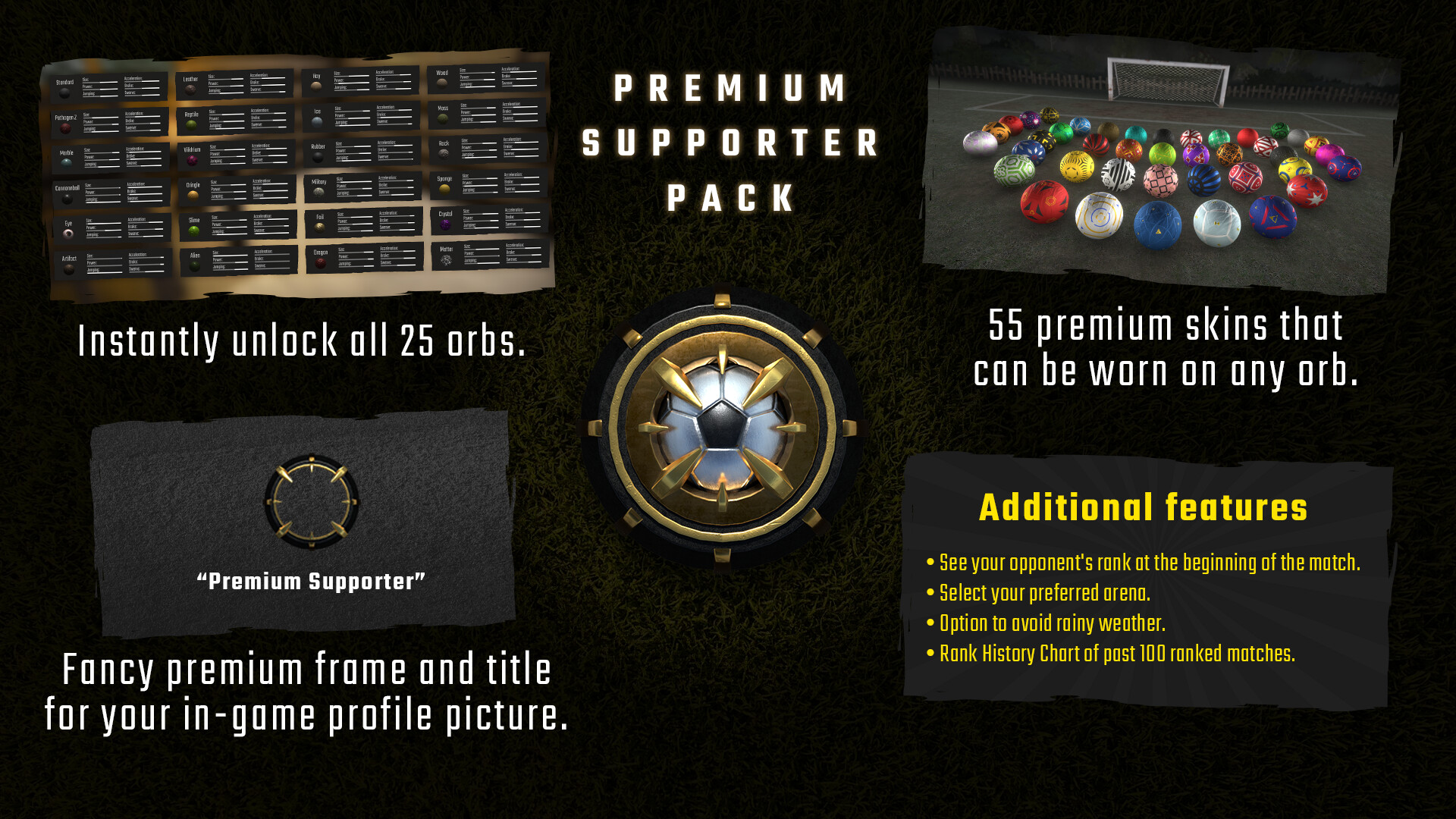 Instantly unlock all 26 orbs and get 57 premium skins that can be worn on any orb. Obtain a fancy premium frame and title for your in-game profile picture. Handful of other useful Premium features.