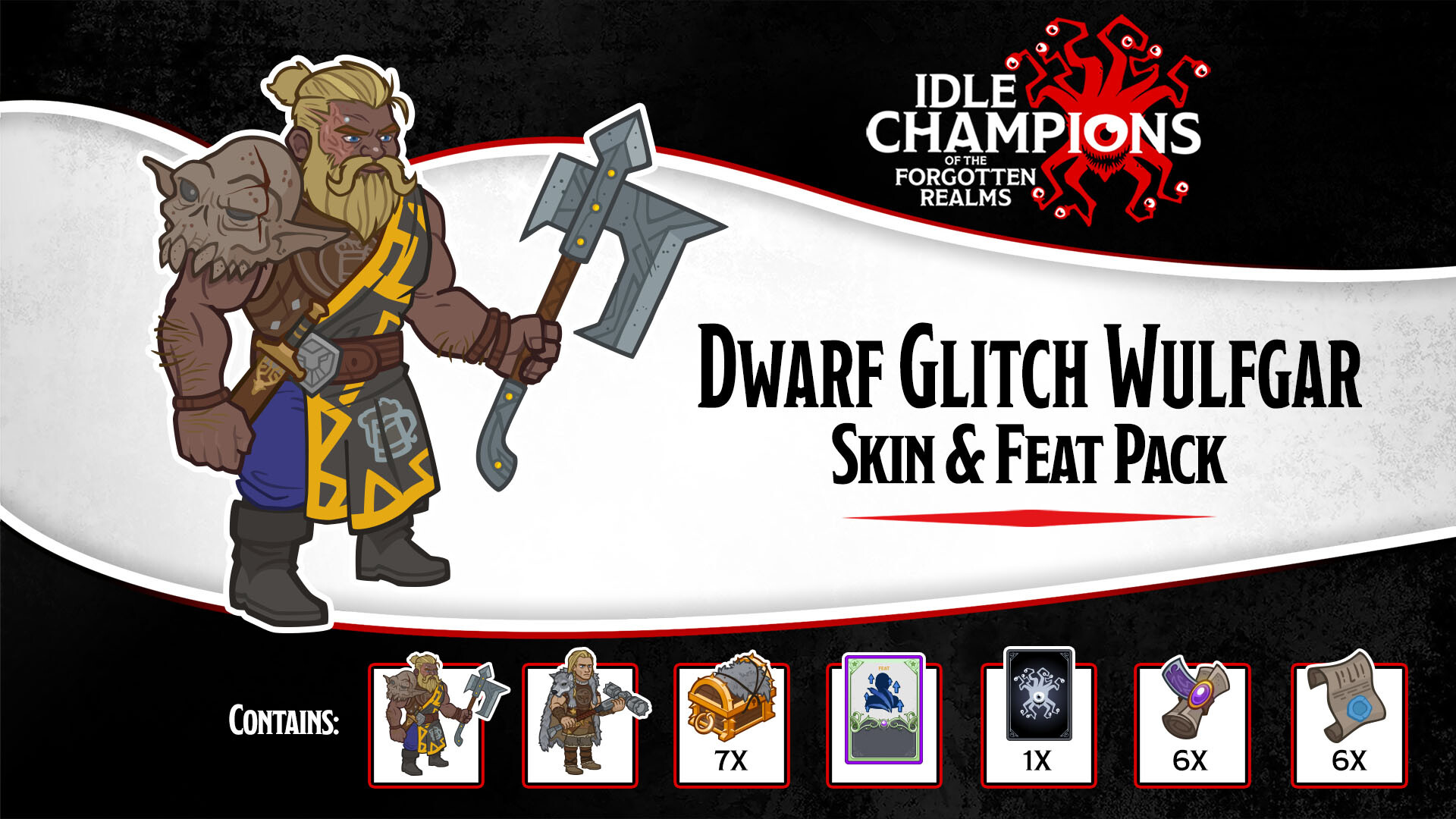 In this pack: Unlocks the Champion Wulfgar (if you don't already own them) Dwarf Glitch Wulfgar Skin An Epic Feat for Wulfgar 7 Gold Wulfgar Chests 1 Guaranteed Shiny Equipment Card 6 Epic Blacksmithing Contracts 6 Epic Bounty Contracts
